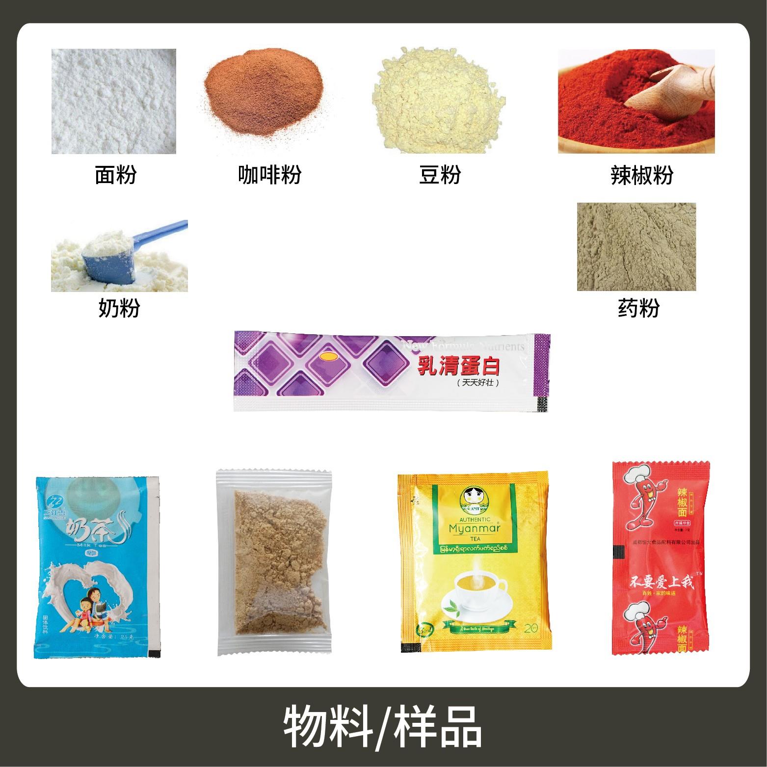 適用于食品、醫(yī)藥、化工、化妝品行業(yè)中顆粒、粉劑、液體、醬料等物品的計量包裝,如:干果、種子、辣椒面、咖啡粉、谷物粉、辣椒油、牛奶等。