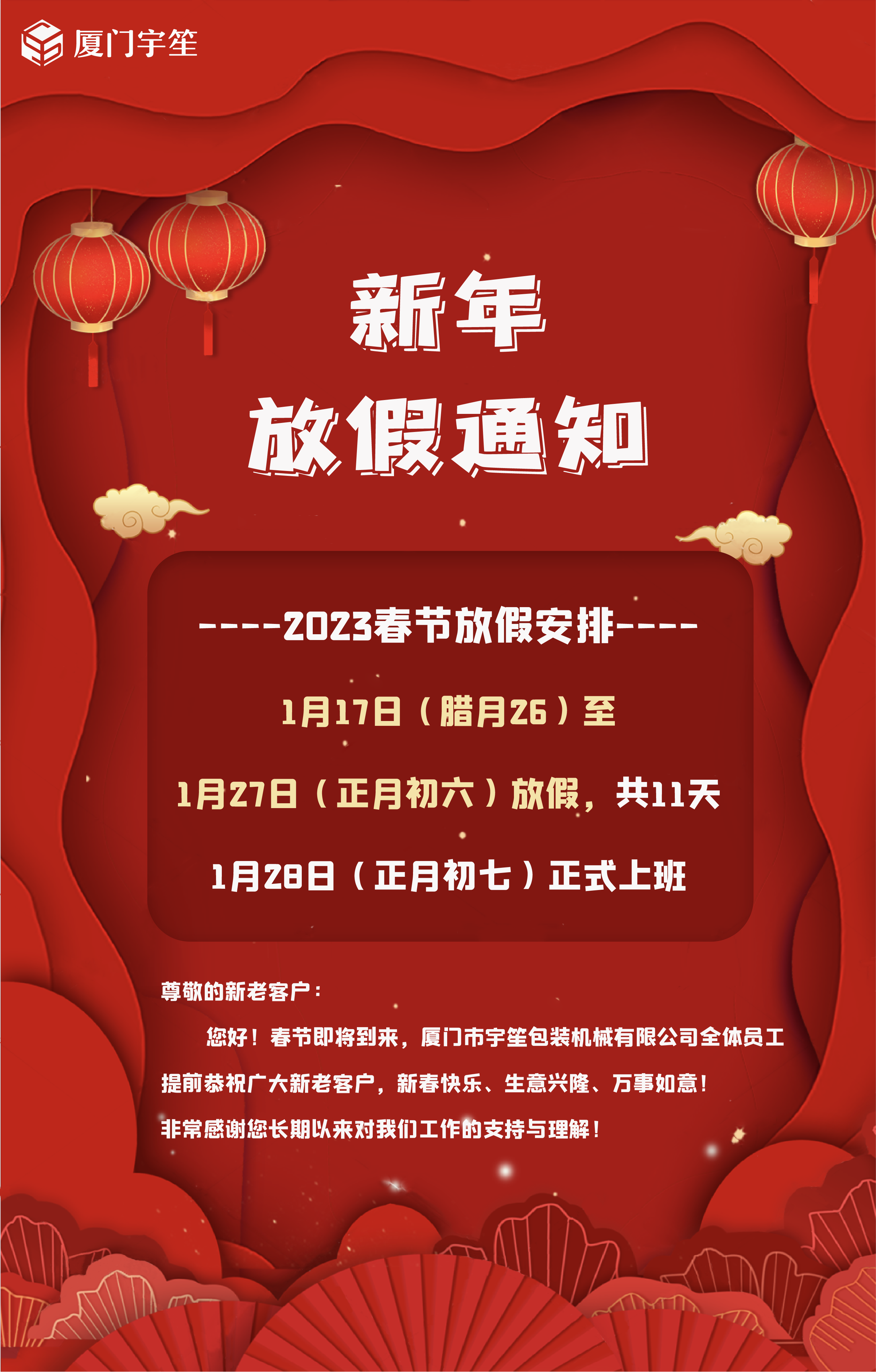 您好!春節(jié)即將到來,廈門市宇笙(宇捷)包裝機(jī)械有限公司全體員工提前恭祝廣大新老客戶新春快樂、生意興隆、萬事如意!非常感謝您長期以來對我們工作的支持與理解!
